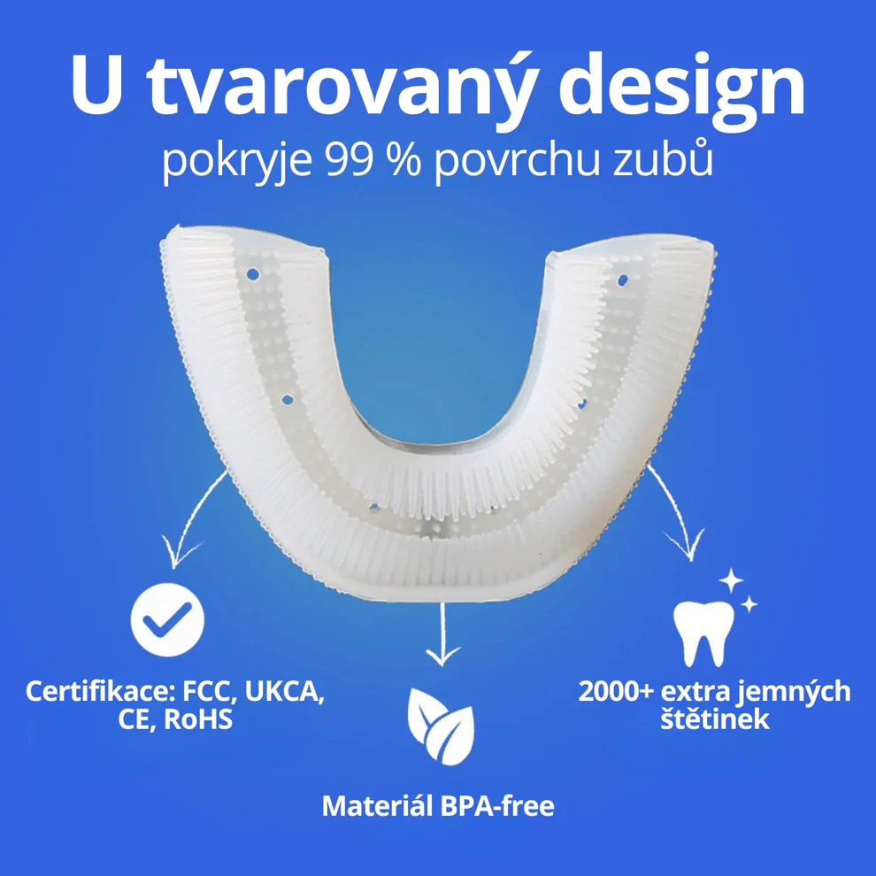 Kartáček má unikátní U-tvar, který pokrývá až 99 % povrchu zubů. Během pouhých 30 sekund čistí všechny strany zubů současně, čímž zajišťuje rychlejší a důkladnější ústní hygienu bez námahy.